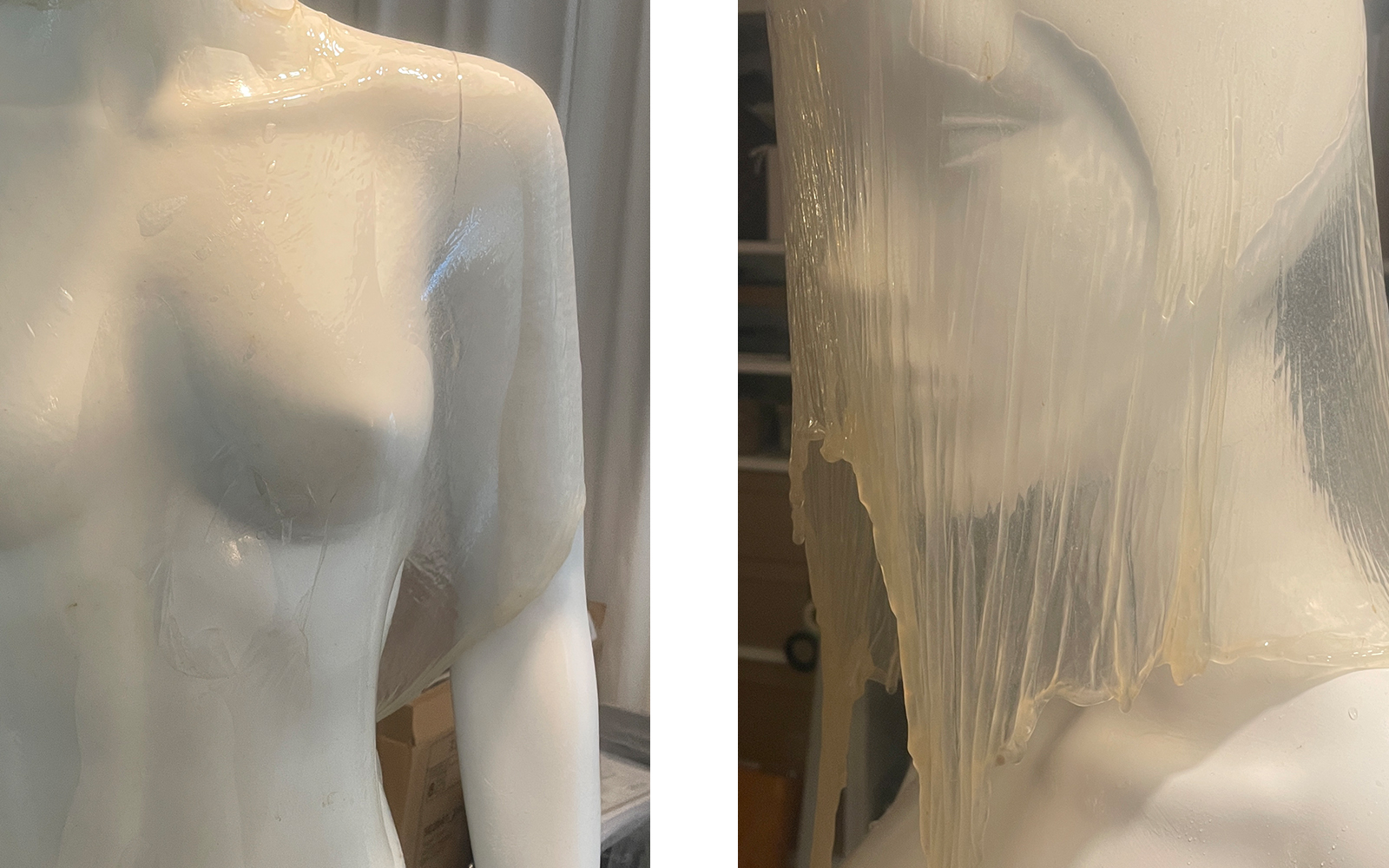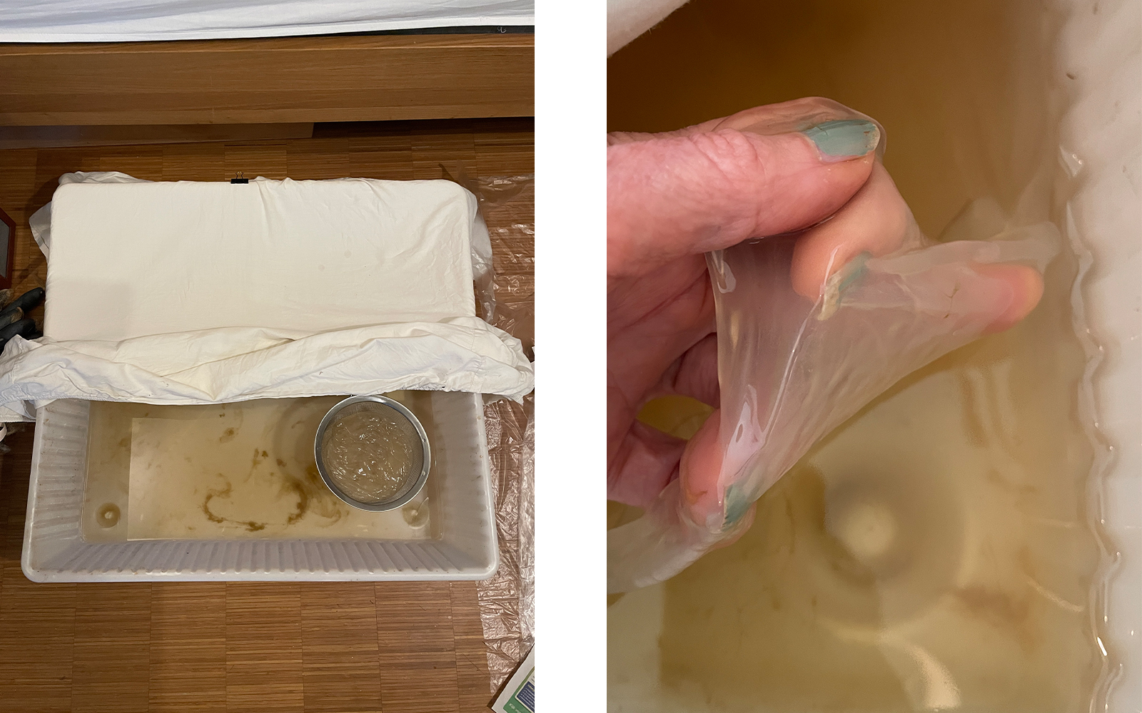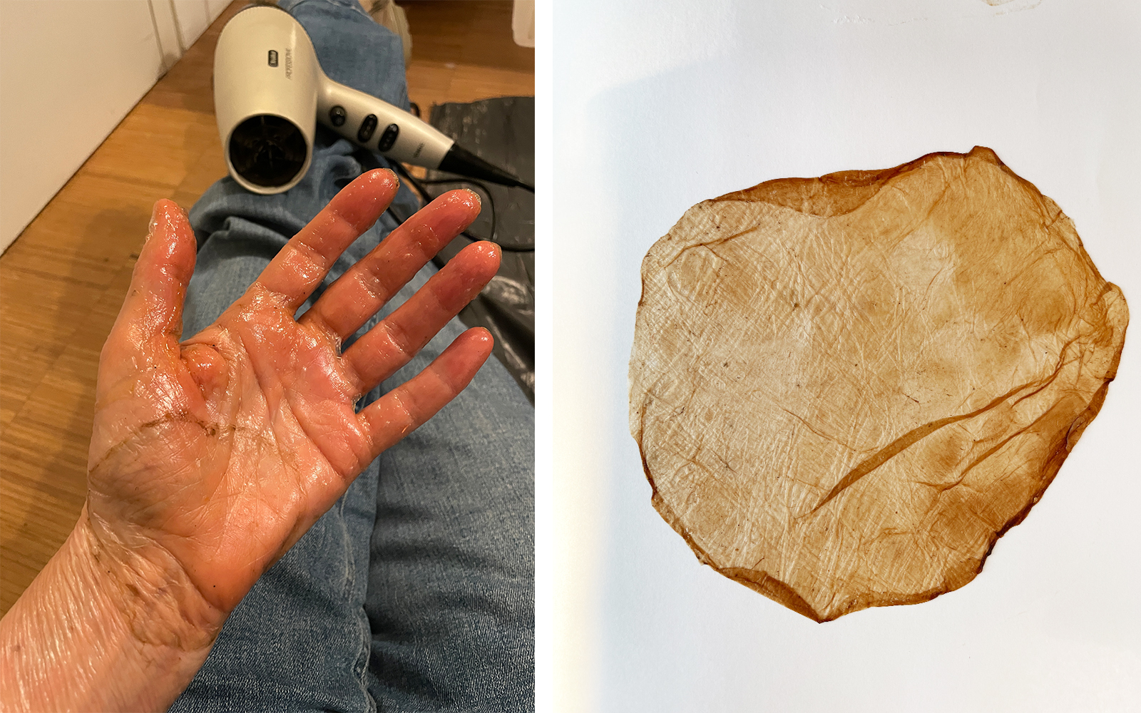 Here I attempt to drape a membrane made from a giant scoby around body parts—first my own, later using a mannequin due to the slow drying time.